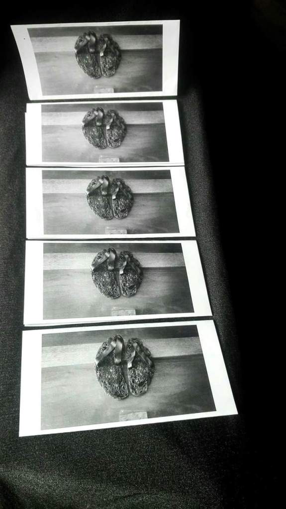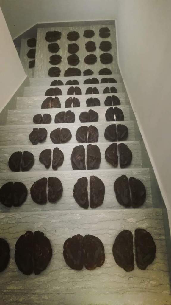 Le numerose paia di calzature in pane combusto (a seconda dei casi allineate, dislocate o caoticamente dispiegate in loco) potranno volta per volta occupare porzioni di stanze, nicchie, gradinate, pianerottoli, davanzali nonché tratti o margini di strade e sentieri.