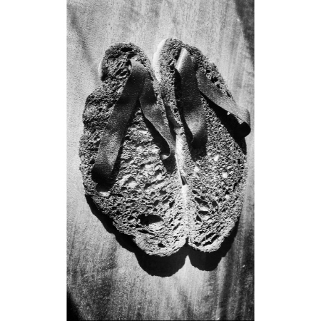 Nelle zone di un invalicabile grano è il titolo di un impianto visivo che consta di un agglomerato di calzature infradito ottenute dalla combustione di fette di pane di disparate misure, depositate sul suolo in modo tale da testimoniare compresenze e intersecazioni di passi. Passi attribuibili e anzi ricollegabili a vite prematuramente stroncate. Vite animate da fragilità o fierezza, corredate di ardimento o al contrario di mera passività.