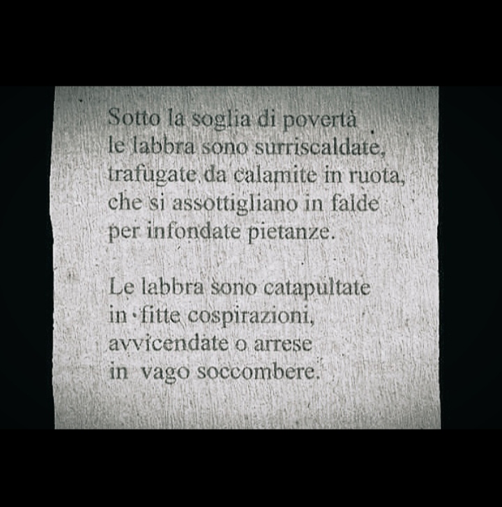 - Infilandosi nelle pagine, si ha a che fare con un ragionato frammentismo logico-emotivo, i frammenti a loro volta vengono utilizzati come cunei per ferire la voce, farla sanguinare, e costringerla a richiamare le sue verità custodite in chissà quali profondità interiori. Il soggetto poetico riavverte se stesso come potenzialmente oggettivo, universale: dentro gli cammina il mondo, non solo il sangue e gli umori del corpo.