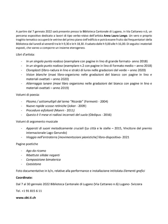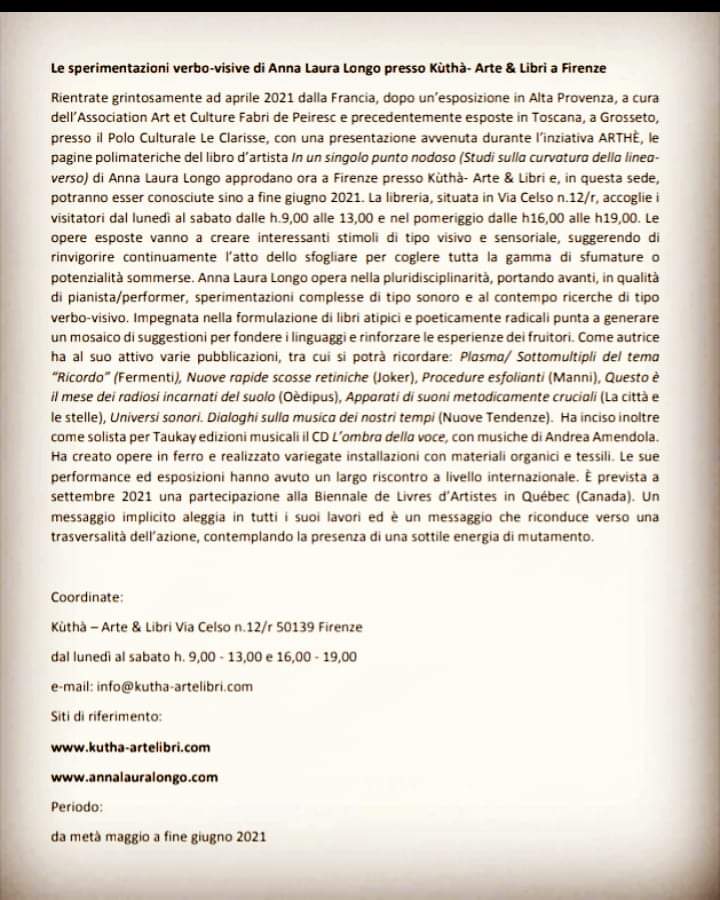 Di seguito il comunicato che fa riferimento all’esposizione svoltasi a Firenze presso Kutha Arte e Libri https://www.firenzetoday.it/eventi/sperimentazioni-verbo-visive-anna-laura-longo-anna-laura-longo.html
