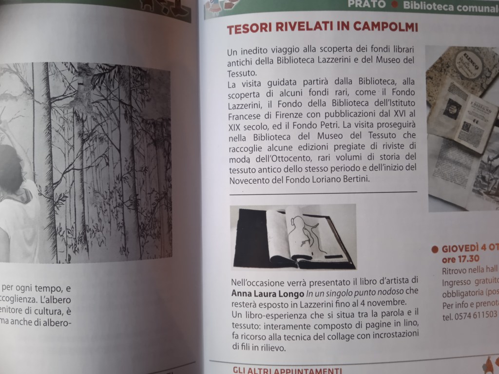 Prato (Italia) Biblioteca Lazzerini (l’inaugurazione è avvenuta in occasione dell’evento “Tesori rivelati “ in collaborazione con il Museo del Tessuto, all’interno della Rassegna Un Autunno da sfogliare a cura del Sistema Bibliotecario Pratese)