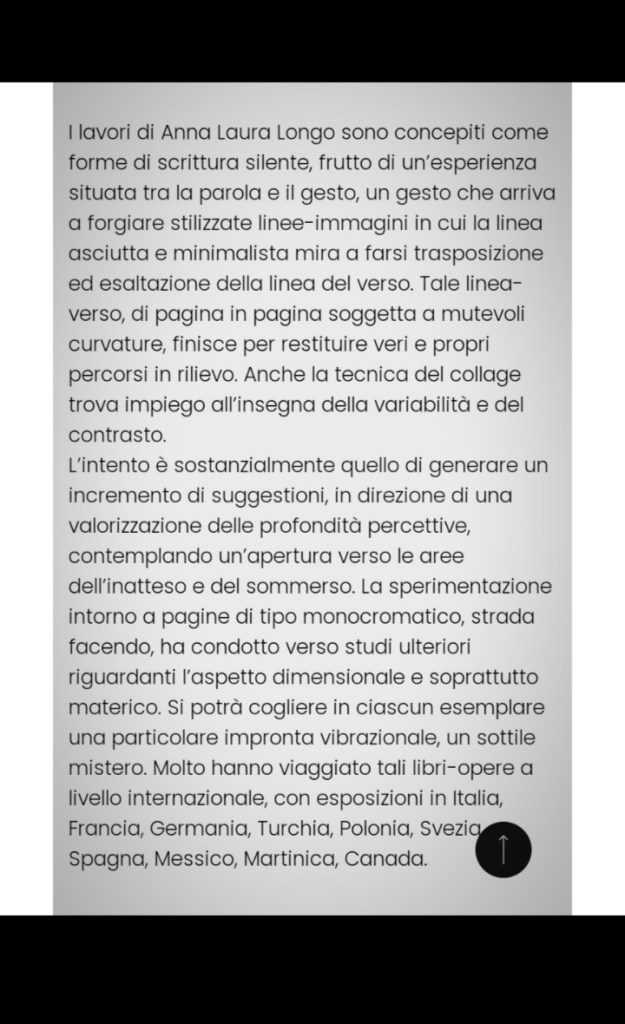 In seguito all’impatto con la nitidezza della pagina d’avvio, di natura testuale, il fruitore noterà che il processo di lettura potrà essere necessariamente – e avventurosamente- silente. Questo passaggio, assimilabile a una modulazione sonora, tenderà a includere una sorta di ammutolimento, generato dalla scomparsa tangibile della parola stessa, da un suo riassorbimento, in vista di un potenziamento dell’aspetto “magico-visivo”, per una liberazione dell’elemento curvilineo, emblematico di una nuova energia di versificazione. Sarà questa una morbida transizione, un fatto metamorfico e assertivo, che condurrà inevitabilmente verso un’esperienza di lettura “altra”. Lo sguardo, la mano, il respiro, il tempo di assorbimento saranno protagonisti. Anna Laura Longo